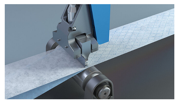 无纺材料也可以使用横向焊缝焊接。与纵向焊缝一样,焊头在固定位置工作,无需上下移动。旋转式底座使之不同。它确保无纺材料在正确的位置与焊头接触,并且只在那里横向焊接。例如用于尿布的侧缝。